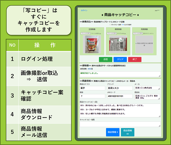 「写コピー」のAIは、商品パッケージの画像から自ら判断してキャッチコピー3案を提示します。また、JANコードの画像からWeb検索をおこない、商品名やメーカ情報を表示します